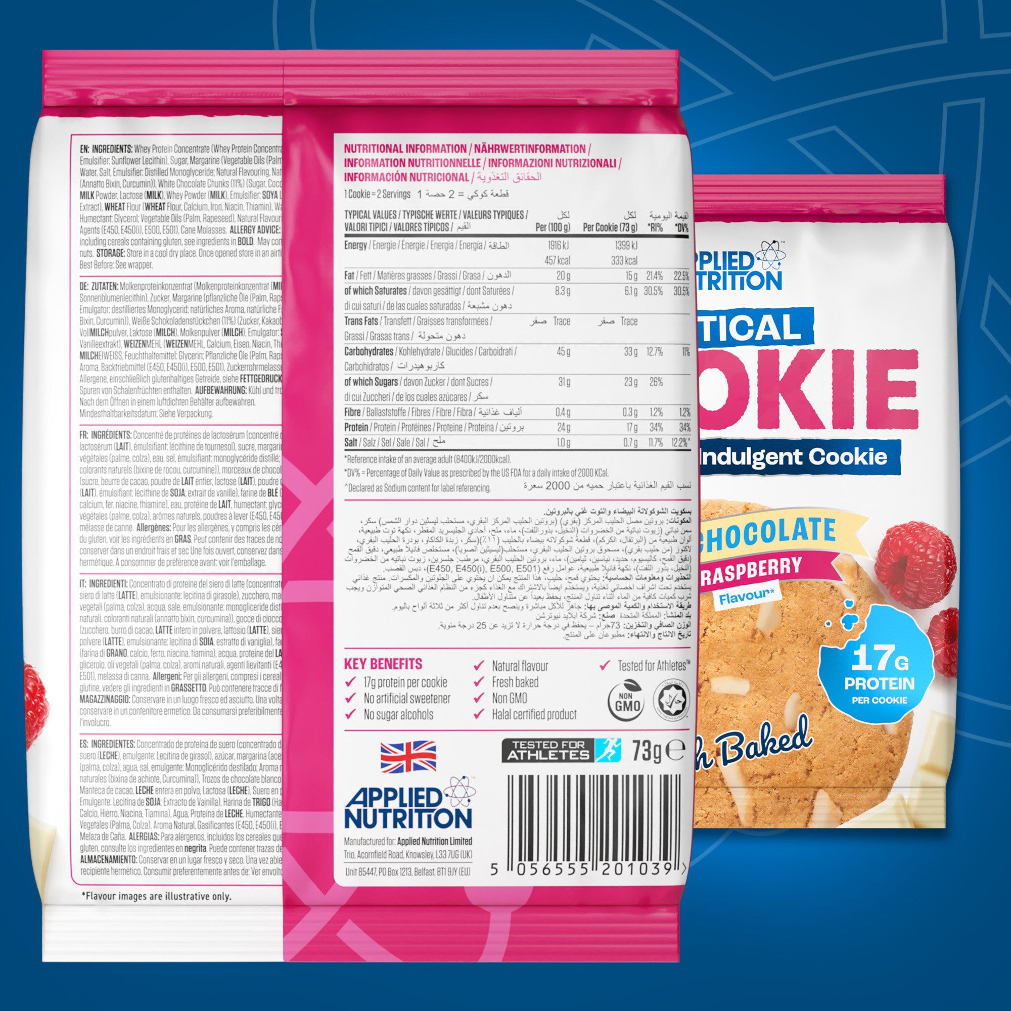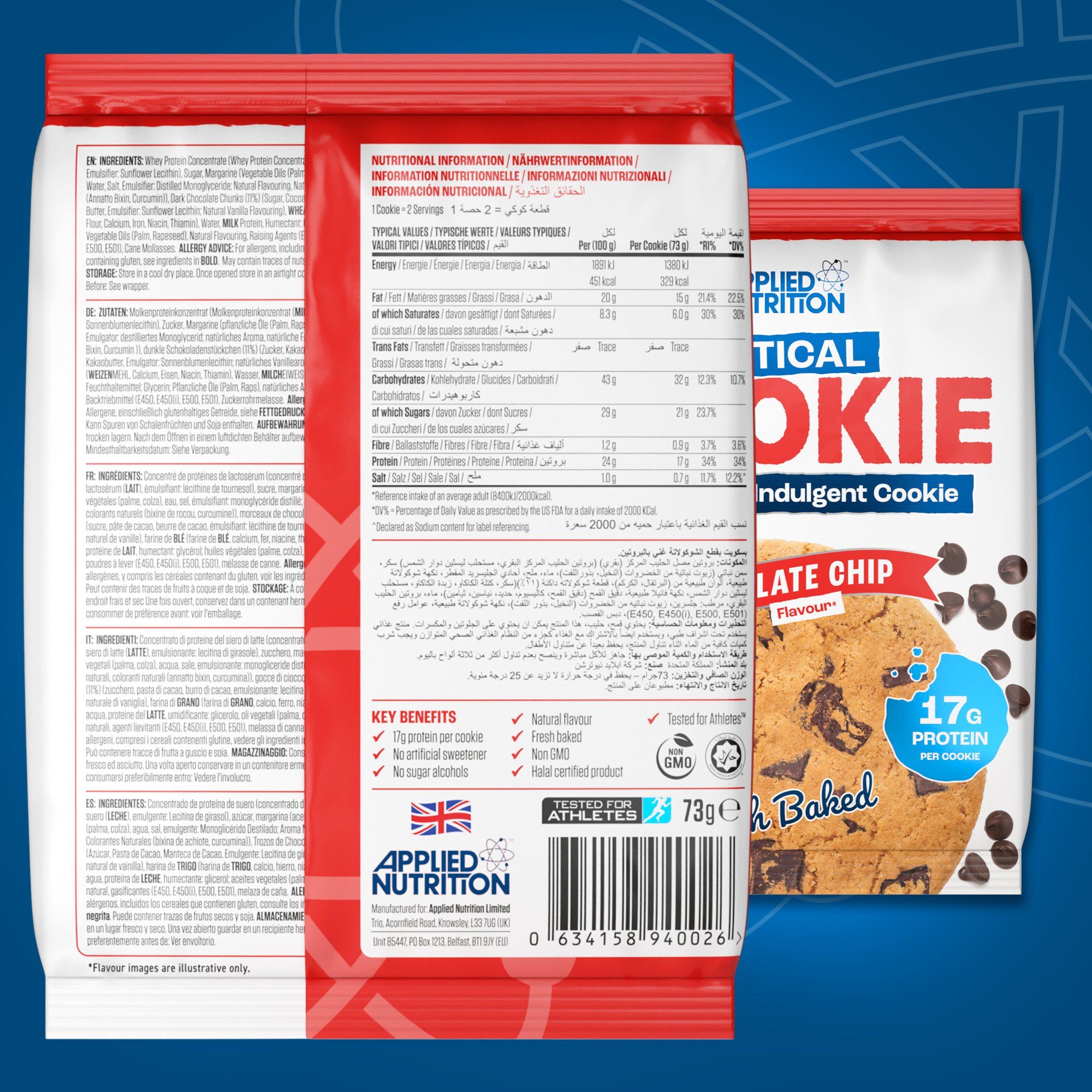 Whey Protein Concentrate (sữa) (chất nhũ hóa: Lecithin Hướng Dương), đường, bơ thực vật (dầu thực vật: cọ, cải, muối, chất nhũ hóa: Monoglyceride chưng cất; hương tự nhiên, màu tự nhiên: Annatto Bixin, Curcumin), socola đen cắt nhỏ 11% (đường, khối ca cao, bơ ca cao, chất nhũ hóa: Lecithin Hướng Dương; hương vani tự nhiên), bột mì (bột mì, canxi, sắt, Niacin, Thiamin), nước, protein sữa, chất giữ ẩm: Glycerol; dầu thực vật (cọ, cải), hương tự nhiên, chất nở (E450, E450(i), E500, E501), mật mía, muối biển.